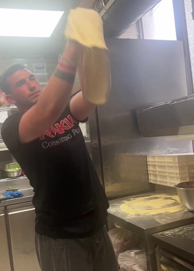 A young man is making a pizza in a restaurant kitchen. He is wearing a black t-shirt with a red logo and gray sweatpants. He has a tattoo on his left forearm and a bracelet on his left wrist. He spins the dough, then lays it flat on a metal countertop covered in flour. The kitchen is stainless steel with various containers and utensils visible. A window with partially closed blinds is visible in the background.