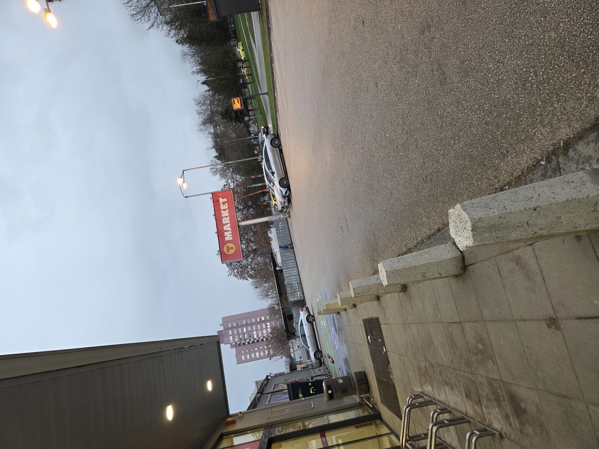 The image displays the exterior of a T Market supermarket in Pleven, Bulgaria, under an overcast sky. In the immediate foreground, to the left, is a concrete sidewalk with metal bicycle racks and a dark cylindrical waste bin. A grey payment/service machine stands beside the building entrance, characterized by large glass panels. An overhead awning with two illuminated recessed lights extends from the building structure. Six light grey, hexagonal concrete bollards line the edge of the sidewalk, separating it from an asphalt parking lot. In the mid-ground, a prominent red sign with white text reading "T MARKET" is visible on a pole within the parking lot. Three vehicles are parked: a silver sedan (likely an Audi A4) near the service machine, and two modern sedans (a silver Mercedes-Benz EQS and a light-colored, possibly gold, vehicle) positioned closer to the center of the parking area. A lone individual, dressed in a blue jacket and dark pants, is seen walking away from the camera near a corrugated metal fence on the right side of the parking lot. In the background, a tall, multi-story residential building with numerous illuminated windows is visible. A multi-lane road features several yellow taxi cabs in motion. An electronic display sign, emitting a yellowish-orange light, stands near the roadside. Deciduous trees, currently bare, and some evergreen trees are scattered throughout the background. The sky is uniformly grey, indicating heavily overcast conditions.