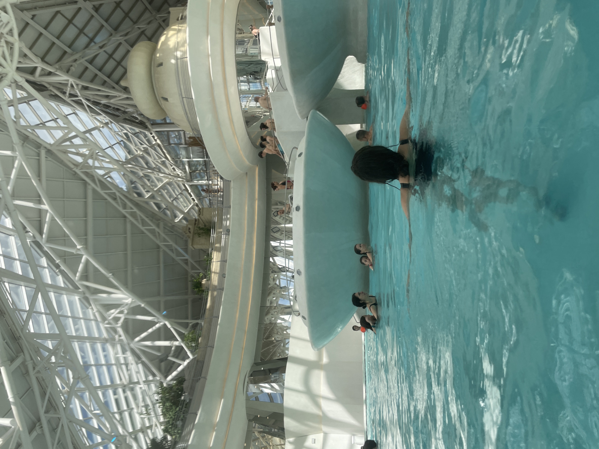The image captures a scene within the Caldea Thermoludic Spa in Les Escaldes, Andorra. The spa features a distinctive architectural design with a large, white, metal-framed glass dome. Inside, a series of interconnected pools and water features are visible. Multiple people are present in the pools, some swimming, others standing and interacting near the edges. The water appears clear and blue, creating a vibrant contrast with the white structures of the spa. The photo shows a swimming pool with people in it, inside of a building that has a white dome ceiling.