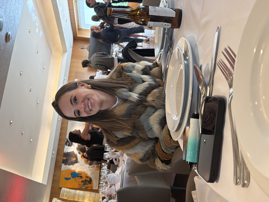 A woman with long brown hair and a multi-toned fur coat smiles at the camera while seated at a table. The table is set with plates, silverware, and a bottle of beer. A black phone and a blue and white vape pen are also on the table. Other people are visible in the background, along with a painting on the wall. The ceiling has multiple recessed lights.