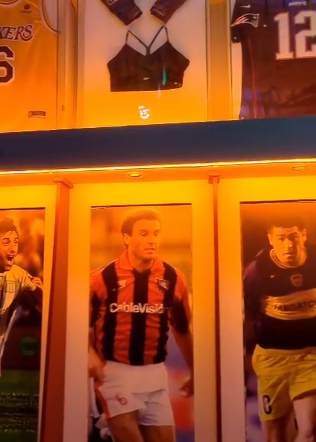 A camera pans across a wall display in what appears to be a sports bar or museum. The display features memorabilia encased in illuminated glass boxes. On the top row, there are sports jerseys and equipment, including a yellow Los Angeles Lakers jersey with the number 6, UFC gloves and a sports bra, and a purple football jersey with the number 12. Below this are portraits of famous Argentinian soccer players, including one wearing a red and black striped jersey with the words "CableVision" on it, and images of Diego Maradona and Lionel Messi in the Argentinian national team jersey. The environment has an orange hue due to the lighting.