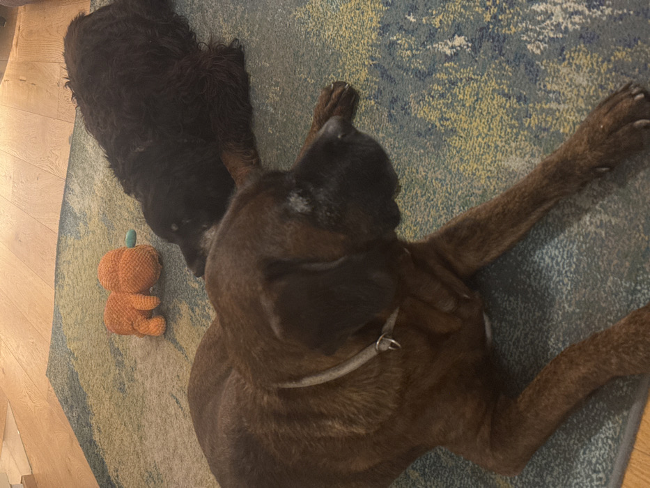 This image, taken indoors in Baden, Austria, depicts two dogs resting on a patterned area rug adjacent to a wooden floor. In the foreground, positioned slightly left of center, a large, dark brown brindle-coated dog is lying down with its front paws extended. This dog wears a light gray collar with a metal ring and exhibits white-gray fur around its muzzle, indicative of age. Its head is turned towards the right, away from the viewer. In the background, to the right, a second dog with dark brown to black long, wavy fur is lying down, facing left, with its head resting. This dog also displays white-gray fur around its muzzle. Between the two dogs, closer to the background dog's head, an orange, knitted or crocheted plush toy, possibly shaped like a pumpkin or a squat animal, with a small green protrusion, rests on the rug. The rug features an abstract pattern predominantly in shades of teal, blue, green, and yellow-gold. A light-colored wooden floor is visible in the upper left corner of the frame. The scene is illuminated by warm, artificial light. No human subjects are visible.