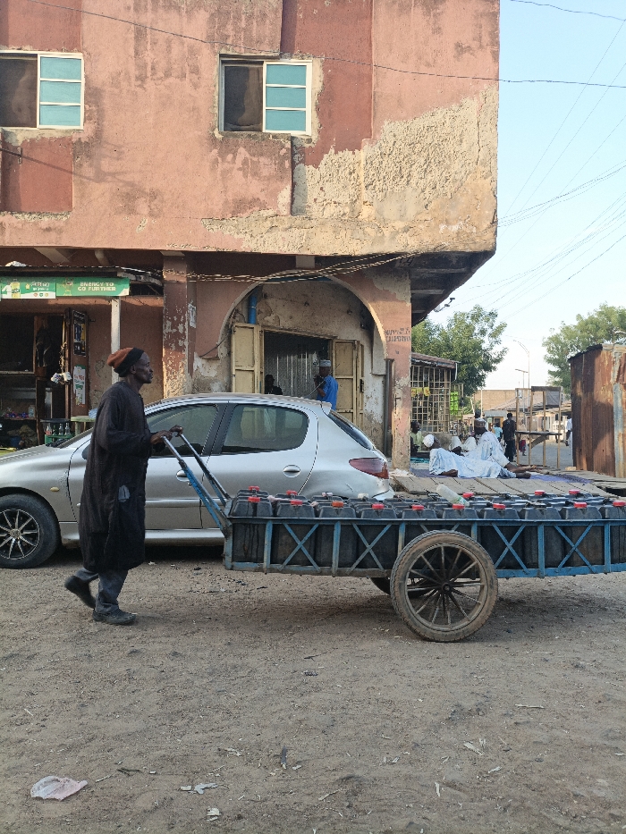 An adult male, wearing a black robe, dark trousers, dark shoes, and a reddish-brown cap, is depicted walking from left to right on an unpaved, dusty street in Gwagwarwa, Nigeria. He pushes a blue-framed, two-wheeled handcart laden with approximately thirty black rectangular containers, each with a red cap, arranged in rows. Behind the man and cart, a silver hatchback car (Peugeot 206 model) is parked. To the left, a weathered, two-story building with reddish-brown painted walls stands. Its upper floor features two windows with light blue frames. The ground floor has a shop entrance marked by a green sign reading "ENERGY TO GO FURTHER". Adjacent to this, another shop entrance with an arched opening reveals a person in a blue shirt inside. Further right, in the mid-ground, two men in white traditional attire are seated or reclining on a raised wooden platform. The background includes green foliage, additional indistinct figures, rudimentary structures made of corrugated metal, and overhead power lines against a clear, light blue sky. Debris, including a pink plastic bag, is visible on the dusty ground in the foreground.
