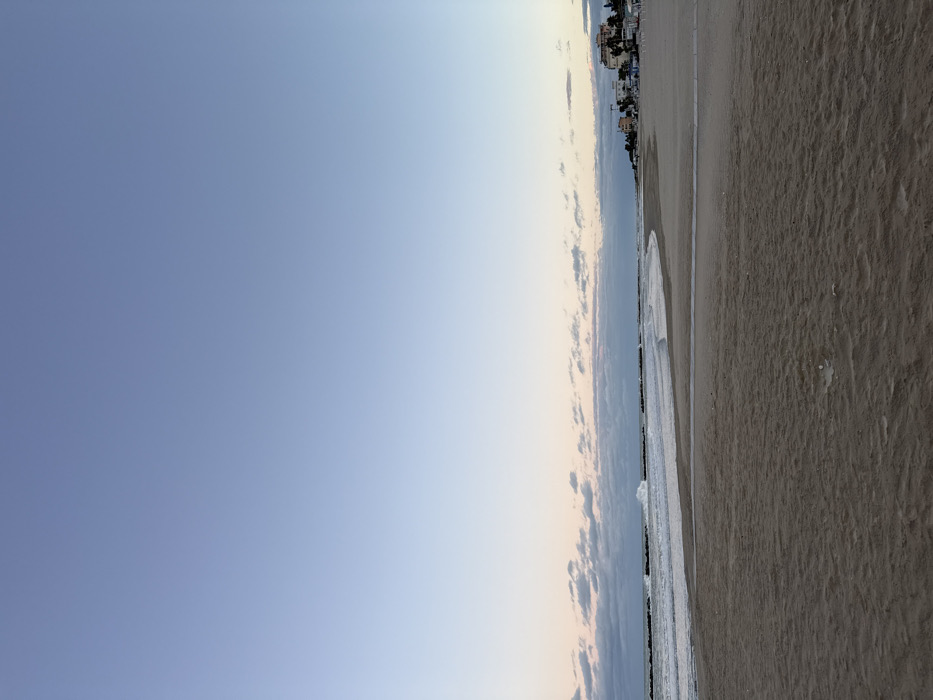 The image displays a coastal scene in Grottammare, Italy, facing the Adriatic Sea during twilight. The upper 60% of the frame is occupied by a clear sky, transitioning from a light blue at the zenith to a paler, slightly yellowish-pink hue at the horizon. A horizontal band of scattered stratocumulus clouds is present above the sea. The middle ground features the sea, exhibiting moderate waves breaking onto the shore and against a series of dark, elongated rock groynes extending perpendicularly from the coastline. A prominent white-crested wave is breaking near the center-left, behind one of the groynes. The water appears a greenish-blue. The foreground consists of a wide, unpopulated sandy beach, displaying a light brown coloration with subtle undulations and evidence of receding water lines. The beach curves gently from the center-left towards the right side of the frame. In the distant right, along the shoreline, a cluster of low-rise buildings with light-colored facades is visible. In front of these structures, indistinct white objects, consistent with beach umbrellas or tents, are discernible on the sand. Scattered palm trees are also visible near the distant buildings. No people, animals, or direct interactions are observed within the scene.