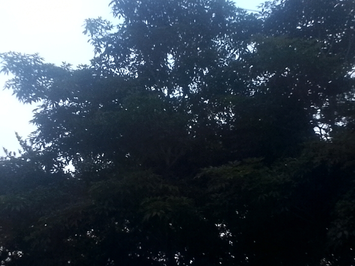 - "The scene depicts a dense canopy of dark green foliage from one or more large trees, viewed from below against a bright, uniformly overcast sky" by FM-KTWa22, licensed under CC BY 4.0