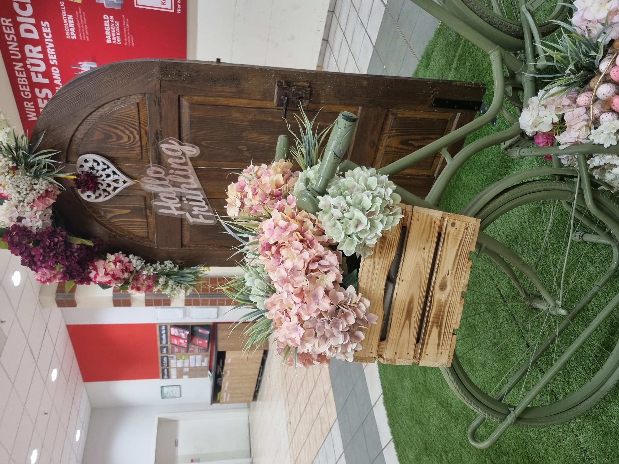 The image depicts a promotional spring display located within a REWE supermarket in Saarbrücken, Germany. No individuals are present in the scene. In the foreground, an olive-green, antique-style bicycle, functioning as a stationary prop, rests on artificial green turf. A wooden crate is affixed to the front of the bicycle, containing a prominent arrangement of artificial hydrangeas in shades of pink, peach, and light green, interspersed with green foliage. Near the bicycle's pedals and rear wheel, an additional cluster of artificial white and pink flowers is visible alongside several speckled pastel Easter eggs arranged within a faux bird's nest. Directly behind the bicycle stands a dark brown, arched wooden door, also serving as a decorative prop. A white, intricately carved heart-shaped ornament hangs from the top center of the door, below which a translucent sign displays the German text "Hallo Frühling" (Hello Spring) in a script font. A garland composed of artificial dark pink, white, and green flowers drapes over the top and left side of the door. A rusted metal lock mechanism is observable on the right side of the door. The background reveals the interior of a supermarket. To the left of the wooden door, a red accent wall is visible above a light-colored wooden service counter or display unit. A white door and bulletin boards containing various notices are partially visible further to the left. The floor is tiled with light beige and grey square sections. To the right of the wooden door, a large red wall displays white German text, partially reading: "WIR GEBEN UNSERES FÜR DICHLAND SERVICES," "DISCOUNTBILLIG SPAREN" (discount-cheap saving), and "BARGELD ABHEBEN AN DER KASSE" (cash withdrawal at the register). The ceiling is white and features evenly spaced recessed lighting fixtures.