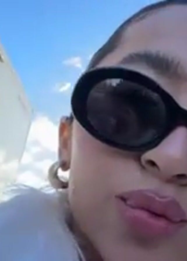 A person wearing dark sunglasses and a white furry jacket is seen from a low angle, looking into the camera and puckering their lips as if giving a kiss