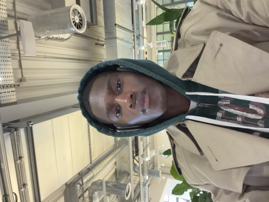 A dark-skinned male subject is depicted in a close-up, head-on portrait. He wears a dark green hooded sweatshirt with the hood up, a white t-shirt underneath, and a light tan trench coat partially buttoned over it. Silver over-ear headphones are worn. The subject has dark eyes and full lips, maintaining a neutral expression. The background displays a modern indoor environment with an exposed industrial-style ceiling, featuring extensive silver metallic ductwork, pipes, and various rectangular and circular lighting fixtures. Grey structural beams and white perforated ceiling panels are also visible. Green foliage from a plant is present in the lower right, and diffused natural light enters from windows or glass partitions in the far background. This setting is consistent with a contemporary commercial or public building in London, United Kingdom.