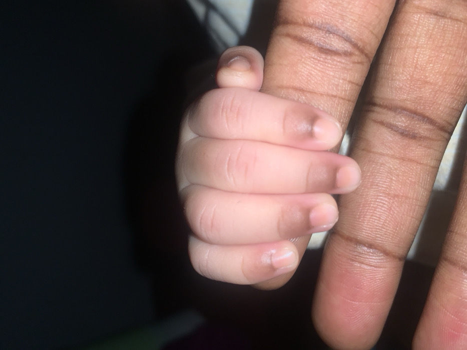 The image displays a close-up view of two hands. A smaller, light-skinned hand, likely an infant's, is gripping the index finger of a larger, dark-skinned adult hand. The infant's fingers are curled tightly around the adult's finger, with the infant's fingertips and knuckles visible. The infant's skin is light pinkish-beige, with darker pigmentation around the nail beds and knuckles. The adult's index finger exhibits dark brown skin tone with visible epidermal ridges. The background is dark and out of focus, providing no discernible details or objects. The lighting appears dim. The image provides no visual markers to identify the location as Rafin Bauna, Nigeria.