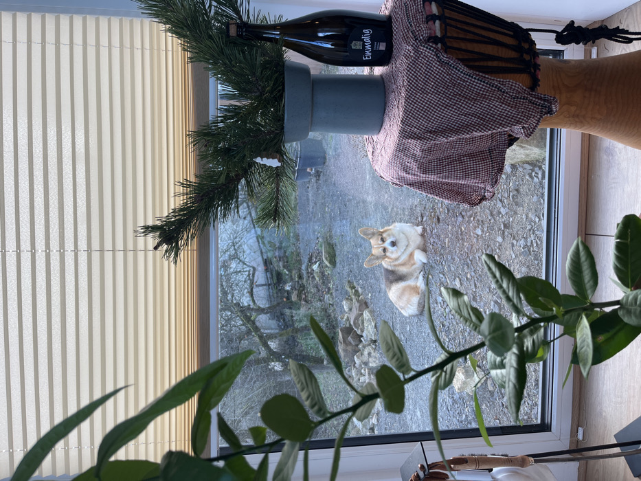 The image presents an interior perspective looking out a window onto an exterior scene in Gangloff, Germany. In the interior foreground on the left, a vibrant green potted plant is partially visible. On the right, a djembe drum, light brown in color with dark rope detailing, supports a reddish-brown and white checkered cloth. Upon this cloth rests a gray cylindrical vase holding several pine branches, from which a small white Christmas tree-shaped ornament hangs. Adjacent to the vase is a dark glass bottle with a cork stopper, bearing a label that reads "Einmalig". The upper portion of the window is covered by a beige pleated blind. Outside the window, a tricolor Pembroke Welsh Corgi dog, tan and white with darker markings, is observed lying prone on a gravelly ground surface, facing directly towards the viewer. The exterior environment beyond the dog features sparse, bare trees, bushes, and scattered rocks, indicative of a cool or winter season.