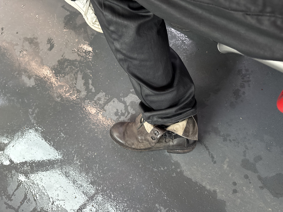 The image displays a ground-level perspective of the lower legs and footwear of two individuals on a wet, dark grey, reflective floor