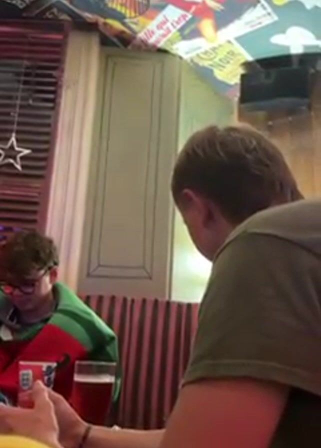 two young men sitting at a table in a bar. The man in the foreground has short brown hair and is wearing a green shirt. He is looking down at his phone and his hands are visible. Behind him and to the left, another man sits wearing glasses and is covered in a red and green flag with the emblem of England on it. On the table in front of him, there is a glass of red liquid, probably beer or wine. The ceiling is covered in a collage of vintage posters. There are light fixtures hanging from the ceiling. The overall lighting in the bar is somewhat dim. The general ambience seems to be one of socialising and relaxation.