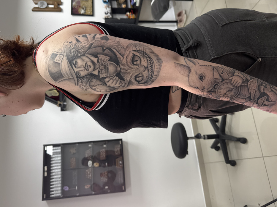 A woman's arm displays a detailed black and gray tattoo sleeve