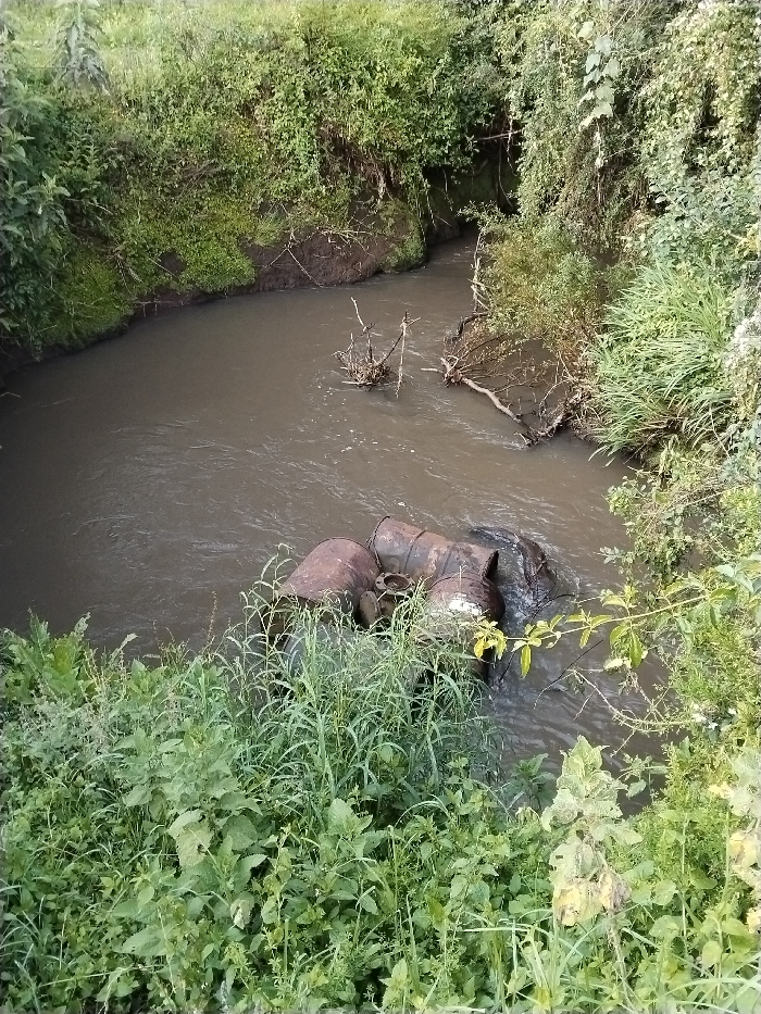 The image depicts a section of a murky, brown waterway, identified as being in Ndiara, Kenya. The water exhibits a discernible current, evidenced by surface ripples. Both banks are steep and densely overgrown with lush green vegetation, including tall grasses, broad-leafed plants, bushes, and vines, some of which overhang the water. In the foreground, against the left bank, a cluster of approximately four or more rusted metal industrial barrels is partially submerged in the water. One barrel, positioned near the water's edge, clearly displays a pipe-like fitting or valve on its exposed surface. Further into the waterway, towards the center and right bank, several accumulations of dead branches and roots are visible, some partially submerged. The background shows the waterway curving and disappearing into additional dense vegetation. No individuals or animals are present in the scene. The overall environment suggests a natural setting with evidence of discarded industrial objects.
