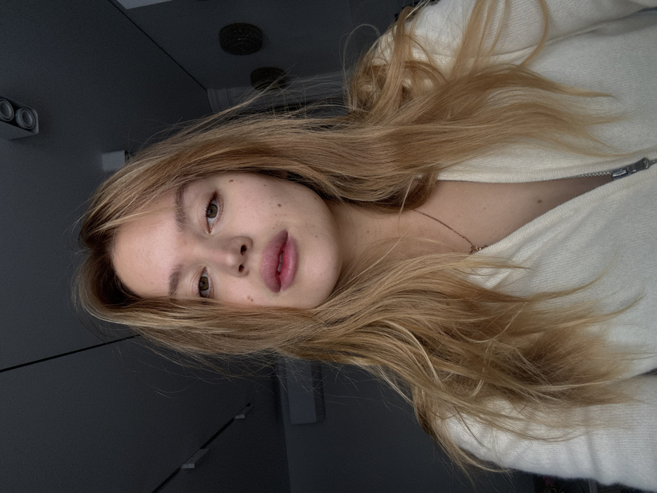 A young adult female with long, light brown hair and a fair complexion is depicted in a close-up, head-and-shoulders portrait