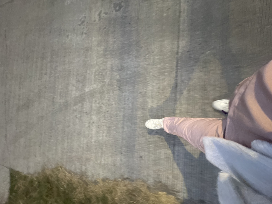 The image depicts a first-person, downward-facing view of an individual walking on a concrete pathway in Davao City, Philippines. The subject is wearing white sneakers and light pink or reddish-brown pants. A segment of a light-colored, possibly white, garment or hand covering is visible in the lower left foreground, closest to the camera. Motion blur is evident, particularly on the legs and ground, consistent with movement. The pathway features variations in concrete texture and color. To the immediate left of the pathway, a strip of sparse, dry grass or vegetation is visible. Shadows are cast to the right side of the subject, indicating a light source emanating from the left and slightly ahead, suggesting an outdoor evening or nighttime setting with artificial illumination.