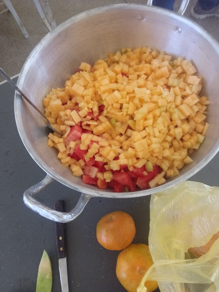 This image depicts a food preparation scene on a dark gray surface, presumably a kitchen countertop, in the city of Unknown, Unknown. A large, dull silver-colored metal pot with two handles dominates the upper half of the frame. The pot is filled with diced fruit, consisting predominantly of light orange/yellow cuboid pieces, likely melon or cantaloupe, with a distinct cluster of red cuboid pieces, identifiable as watermelon, located towards the lower center of the pot's contents. A long-handled silver-colored spoon or ladle is partially submerged in the diced fruit on the left side of the pot. To the lower left of the pot, a kitchen knife with a dark handle and a silver blade lies horizontally, positioned to the right of a curved piece of green fruit peel. To the lower right of the pot, two whole, round, orange-colored citrus fruits are visible. A yellow, translucent plastic bag, appearing partially empty, is situated to the immediate right of these oranges, extending out of the frame on the right. In the upper left background, indistinct white or light-colored vertical and horizontal elements suggest furniture or fixtures. No people are visible in the frame.