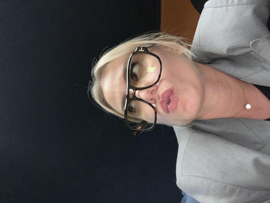 A blonde adult female is depicted in a close-up, upward-angled shot against a dark, undifferentiated background. She is wearing large, dark-framed eyeglasses with visible "Tom Ford" branding on the temples. Her eyes are directed upwards and slightly to the right. Her lips are puckered into a distinct pouting or kissing expression. She is clothed in a light grey blazer over a dark garment, and a delicate gold-colored necklace with a small, light-colored circular pendant rests on her lower neck. A rectangular yellowish-green reflection is visible on the right lens of her eyeglasses. The environment is featureless and does not provide any identifying details of a specific location, including Saint-Médard-en-Forez, France.