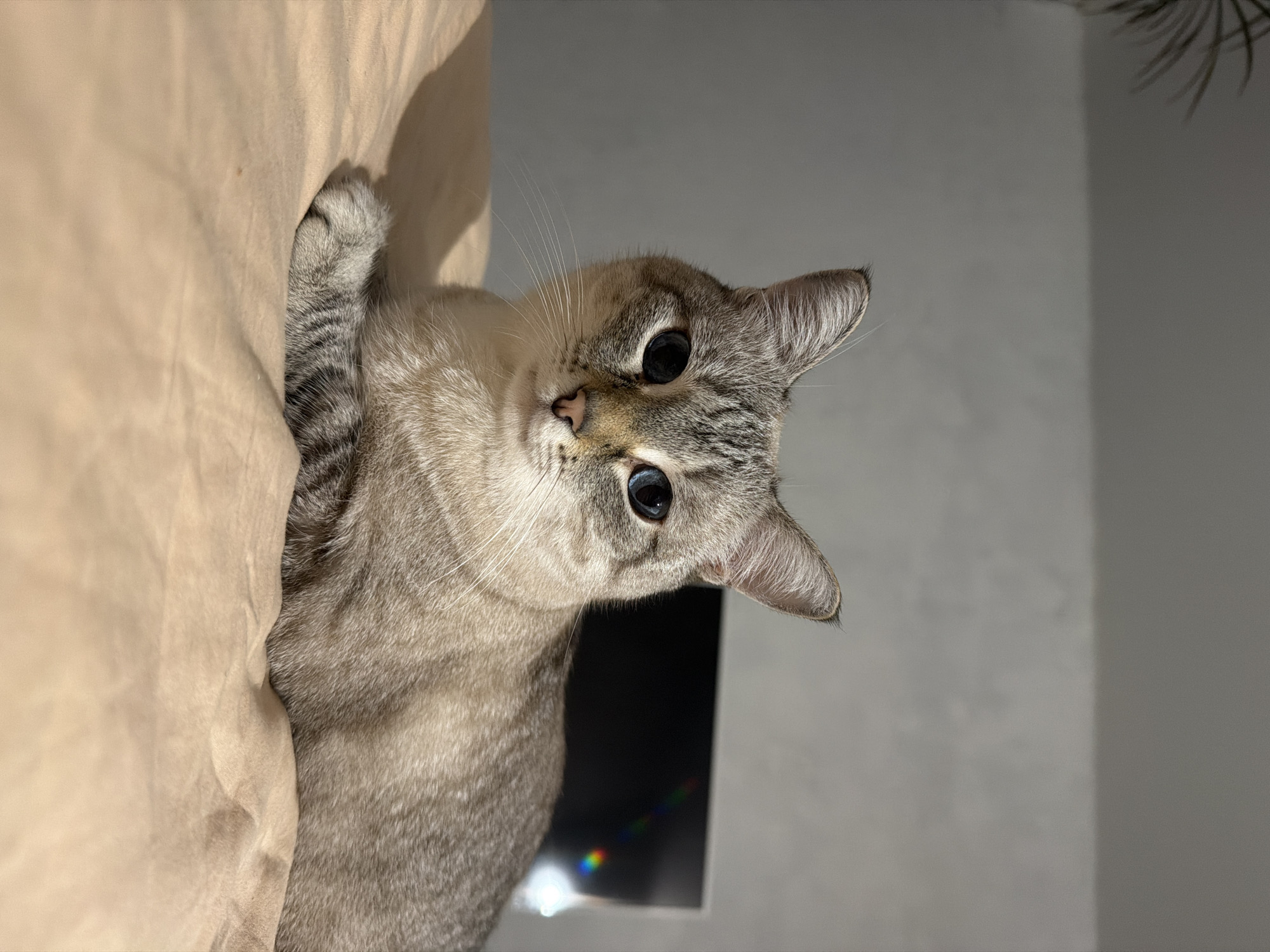 - "A gray tabby cat with blue eyes is lying on a beige pillow in what appears to be an indoor setting" by FM-pEr6u2, licensed under CC BY 4.0