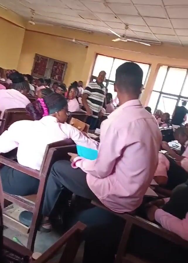 classroom full of students. Most students are wearing pink shirts and black pants. A man in a striped shirt is standing in the front of the classroom speaking. The students are sitting at desks and some are looking at the man. Other people are visible in the background near the window. The classroom has a ceiling fan, and the walls are painted in shades of yellow and pink.