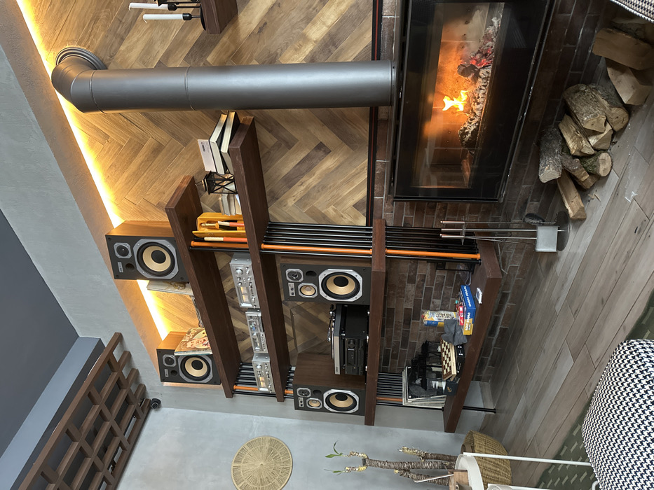 This image depicts an interior scene, likely a lounge or common area, located in Tsakhkadzor, Armenia. The focal point is a multi-tiered shelving unit crafted from dark wood and supported by metal rods, some black, some orange, against a backdrop of a herringbone pattern wooden wall and a textured light gray wall. On the top shelf, two large stereo speakers with prominent light-colored cones flank a single book. Below this, the second shelf holds three silver-toned vintage audio components, including what appears to be an amplifier/receiver and a tape deck. To their right, several books and a black decorative lantern are arranged. The third shelf features two more stereo speakers, identical to those above, positioned on either side of a turntable and additional audio equipment. The bottom shelf displays an assortment of items: a stack of vinyl records, a chessboard with pieces, various board game boxes, and a gray cloth. To the right of the shelving unit, a modern, enclosed fireplace with a glass front is built into a brick wall, showcasing active flames and glowing embers. A matte gray metal flue extends vertically from above the fireplace, curving towards the ceiling. A pile of split firewood rests on the light-colored plank flooring adjacent to the fireplace, accompanied by a set of standing metal fireplace tools. Above the fireplace, partially obscured, a small shelf holds a black candelabra with two white candles. The wooden herringbone wall is illuminated by a warm LED strip light running along its top edge. The ceiling is a dark gray, and a decorative wooden lattice structure hangs from it in the upper left corner. On the light gray wall to the left, a circular woven decorative piece is mounted. Below it, a tall, slender plant with sparse leaves is placed in a woven basket next to a small, round white table. A portion of a black and white houndstooth patterned ottoman or stool is visible in the lower left foreground. No individuals are present in the scene.