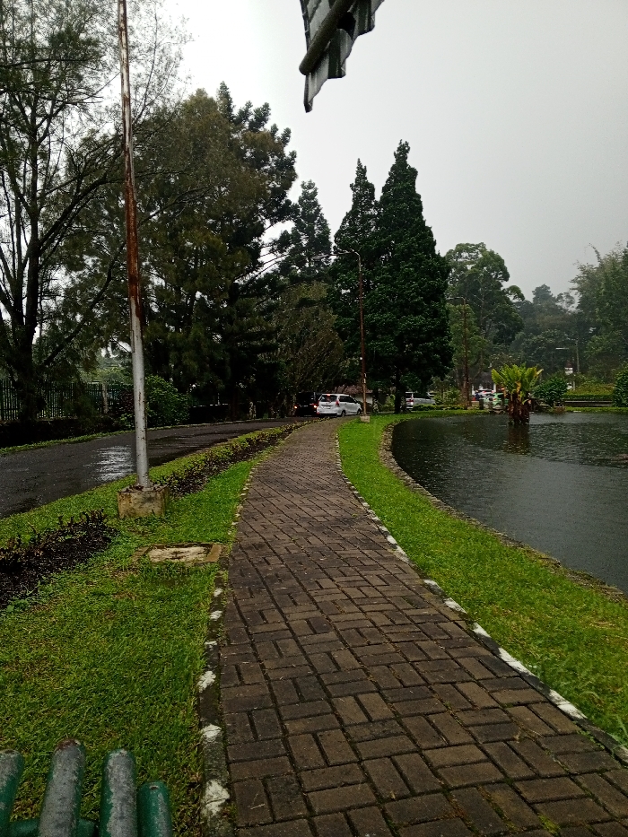 A brick path curves through a park-like setting, bordered by vibrant green grass on either side. A tranquil body of water mirrors the overcast sky, with a small fountain visible. Trees line the perimeter, adding depth to the scene. In the distance, parked vehicles are discernible. A flagpole stands tall, hinting at a public space. The atmosphere is quiet and somewhat misty.