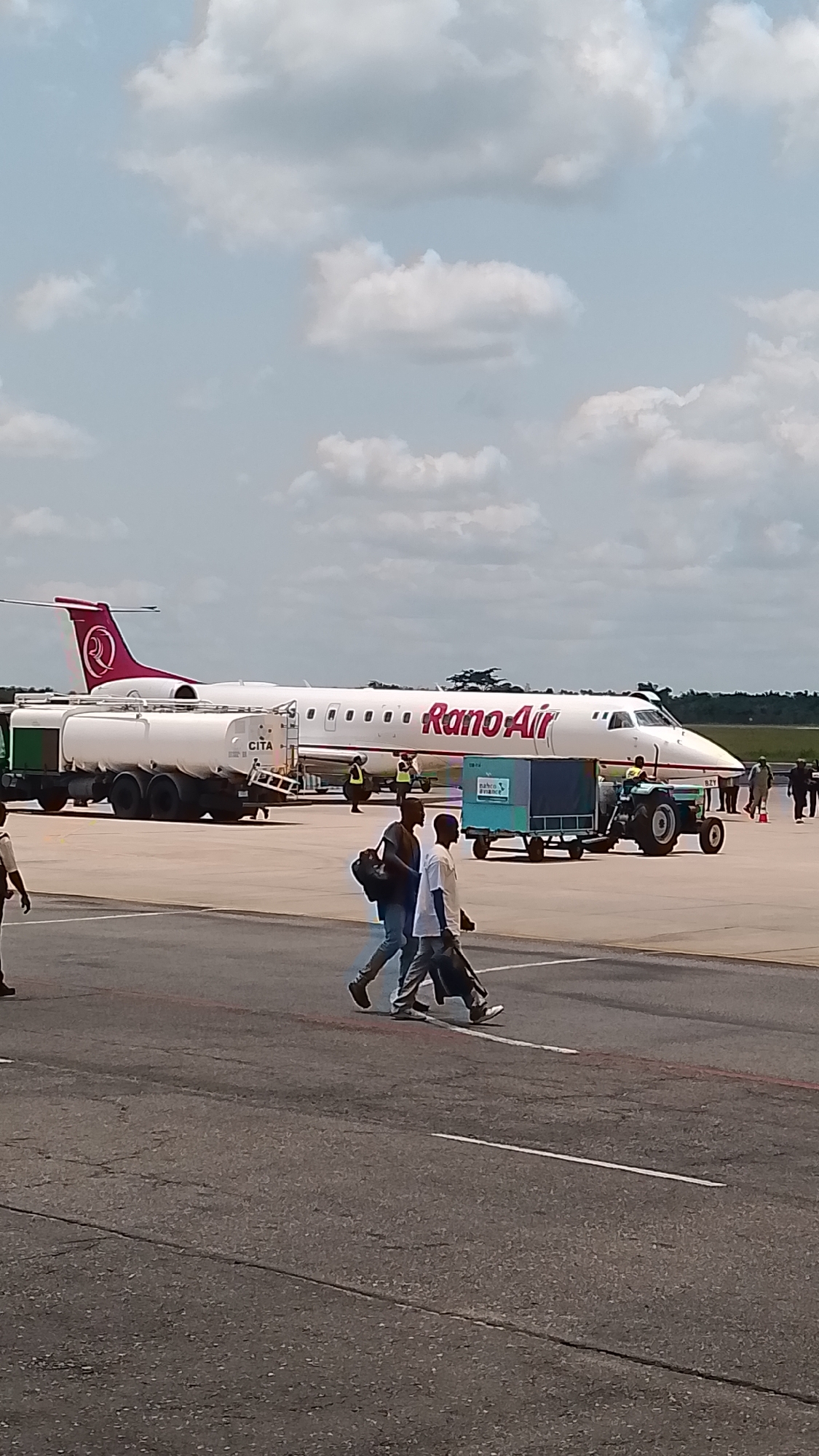 The scene depicts an active airport tarmac in Orerokpe, Nigeria, under a sky with scattered white cumulus clouds. A white passenger jet, identified by "Rano Air" in red lettering on its fuselage and a red logo on its tail fin, is parked centrally in the midground. Adjacent to the aircraft's left wing, a white multi-tanker truck labeled "CITA" is positioned. To the right, a green tractor, displaying "BZY" on its front, is towing a light blue cargo container unit marked "nahco AVIANCE." In the foreground, two men walk from right to left across the dark gray asphalt tarmac, which shows minor cracking and painted white lines. The man on the left wears dark clothing and carries a dark shoulder bag. The man on the right wears a white t-shirt, dark trousers, and carries a dark item in his left hand. Multiple ground personnel, some in high-visibility vests, are visible around the aircraft, with additional figures present in the background. A line of green trees marks the distant horizon.