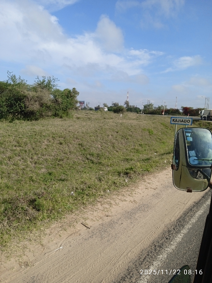 A rural landscape under a partly cloudy sky. A grassy hillside meets a dirt shoulder beside a paved road. A sign reading "KAJIADO" indicates the location. In the distance, utility poles and structures dot the horizon. The scene is captured from inside a vehicle, evidenced by the side mirror and interior details visible in the lower right corner. The date and time stamp "2025/11/22 08:16" appear at the bottom.