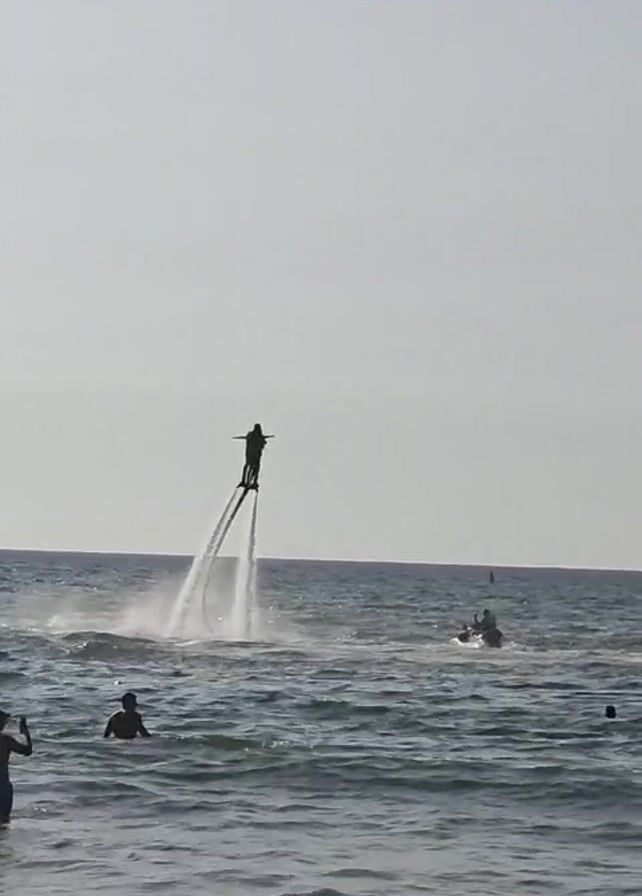 person flyboarding on the ocean, standing on a board propelled by jets of water, with arms outstretched for balance. A jet ski and other people are in the water, with some swimming or standing near the shore. The sky is bright and the ocean is calm with small waves.