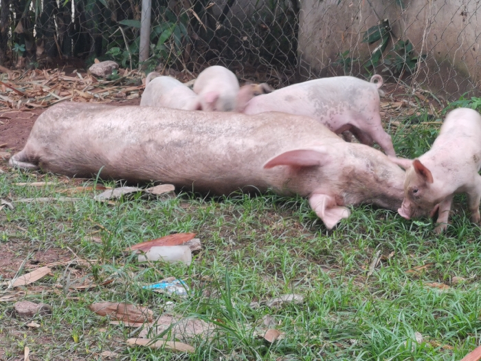 - "A large, light pink pig is lying down on a patch of grass and dirt, with several smaller piglets surrounding it" by FM-t8Vzk1, licensed under CC BY 4.0