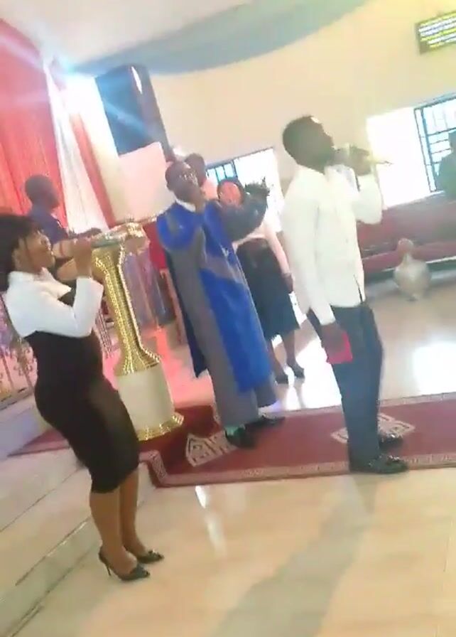 Inside a brightly lit church, a group of people are singing and dancing, likely in worship. A woman in a black and white dress and heels stands to the left, holding a microphone and swaying rhythmically. Next to her, a man in a blue and grey robe stands with his hands clasped, seemingly leading the music. To the right, another man in a white shirt and dark pants sings into a microphone, moving energetically to the music. Other individuals are seen in the background. There is a gold-colored stand to the left of the woman and a red carpet on the floor. The walls are painted, and a blue and white fabric is draped across the ceiling. Light streams in through a window.