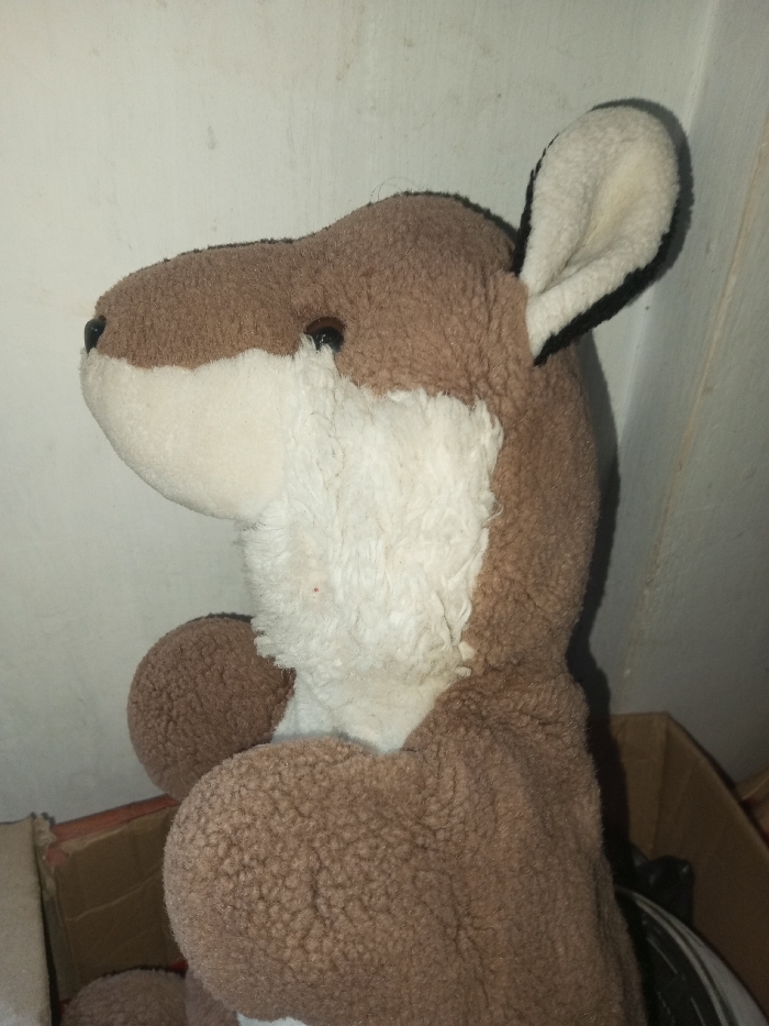 A stuffed kangaroo toy is captured at a slightly elevated angle. The toy features brown and white fur. It's positioned against a white wall, sitting within a partially visible cardboard box. A single ear is visible.