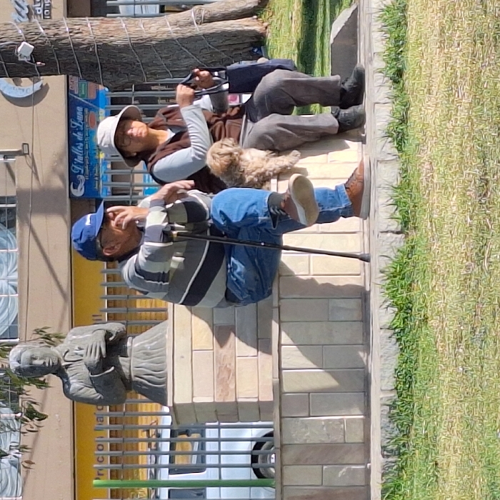Two adults and a small dog sit on a low brick wall. The adult on the left wears a sun hat and brown vest. The adult on the right wears a blue baseball cap and a striped gray, white, and black shirt with blue jeans and brown shoes. They lean on walking canes. A stone statue of a person in a dress is positioned next to the wall. Green grass grows along the side of the brick wall, while a yellow building and blue sign are in the background.