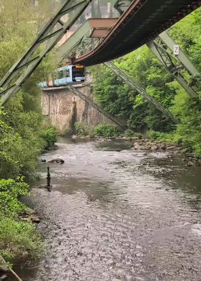 monorail train suspended above a river