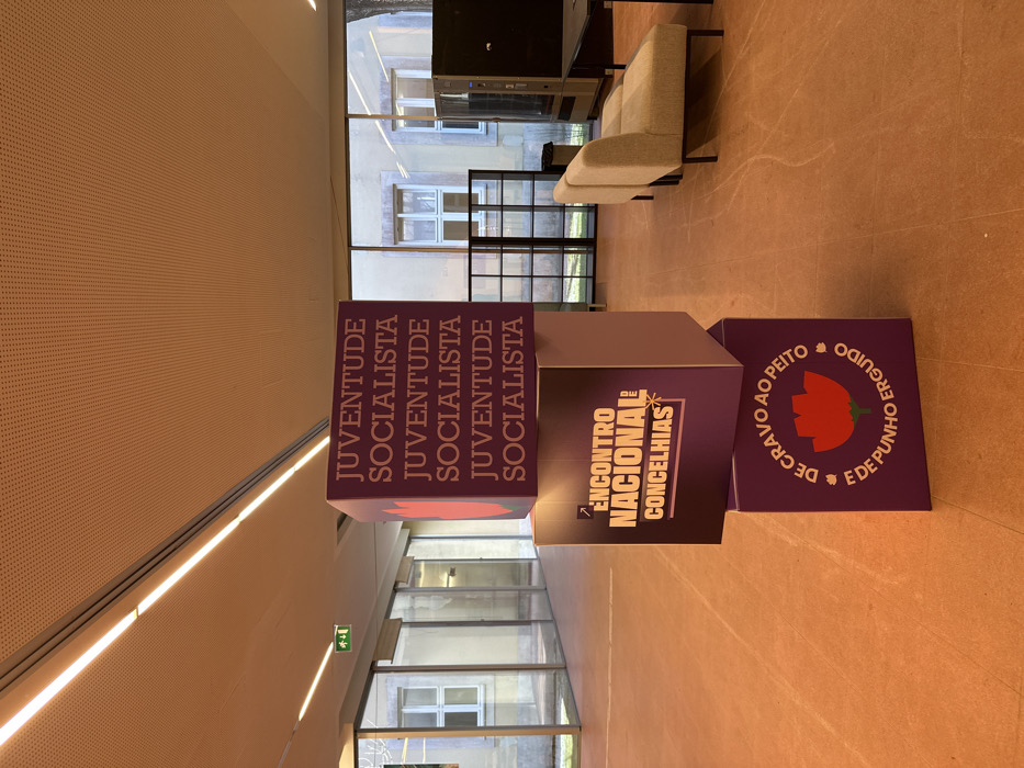 The image depicts an indoor scene in Aveiro, Portugal, centered on a display of three stacked, purple, cubic boxes. The boxes decrease slightly in size from bottom to top. The top box features the text "JUVENTUDE SOCIALISTA" repeated four times in a light-colored font on one visible face, alongside a stylized red carnation graphic on an adjacent side. The middle box displays "ENCONTRO NACIONAL CONCELHIAS" in a light-colored font, accompanied by an upward arrow and a starburst graphic. The bottom box, slightly larger than the others, reads "DE CRAVO AO PEITO E DE PUNHO ERGUIDO" in a light-colored, curved font encircling a prominent red carnation graphic. The environment features a light orange-brown tiled floor and a light-colored perforated ceiling with embedded linear fluorescent light fixtures. An emergency exit sign with a green pictogram is visible on the left side of the ceiling. Large glass windows and walls line the left and right sides of the room, offering a view of an exterior courtyard or garden area with a light-colored building, featuring multiple rectangular windows, in the background. To the right of the stacked boxes, a lounge area is visible, furnished with two light-beige modular sofas featuring dark legs, a dark rectangular table, and a dark vending machine or similar appliance. No individuals are present in the scene.