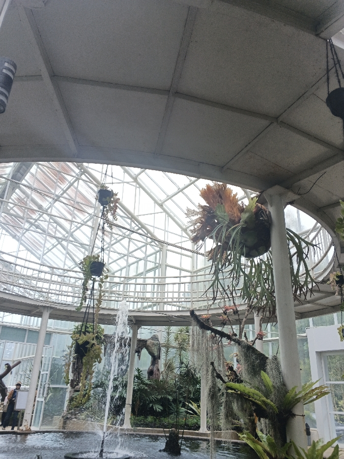 This image depicts the interior of a large botanical conservatory, located in Matopos, Zimbabwe. The scene is dominated by a high, arched glass and white metal-framed roof structure, with a solid white ceiling section present in the immediate foreground. A central fountain actively sprays a plume of water into a dark, circular pool in the middle ground. Various tropical plants and epiphytes are displayed throughout, including multiple dark hanging baskets suspended from the ceiling, one prominently featuring a large staghorn fern and other trailing plants on the right. Additional greenery, including ferns and bromeliads, lines the edges of the pool and forms dense arrangements in the background. Decorative elements include bare tree branches adorned with long, grey-green Spanish moss-like growths. On the far left, in the background, a single individual wearing a dark coat and a hat stands next to a white rectangular sign or board.