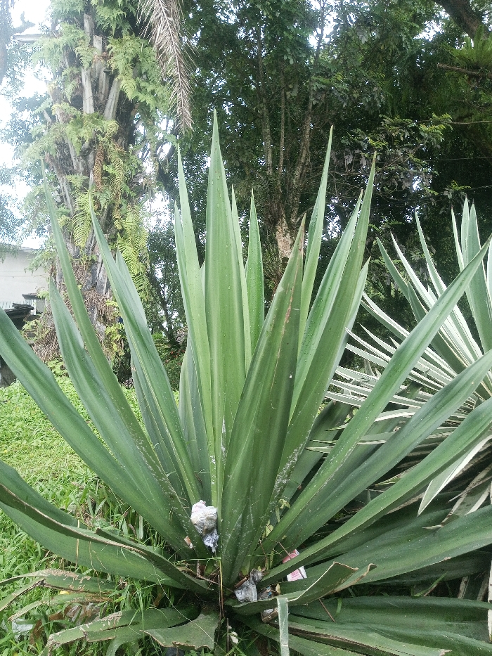 The scene depicts an outdoor vegetated area in Sukanagalih, Indonesia. The foreground is dominated by a large, spiky-leafed succulent plant, likely an agave or similar species, exhibiting numerous long, pointed, green leaves radiating from a central base. Water droplets are visible on some of the leaves. At the base of this plant, several pieces of litter are present, including crumpled white and colorful plastic material. To the right of the primary plant, a second similar plant with lighter-toned or variegated leaves is partially visible. The ground cover consists of green grass and some dry plant debris. In the midground and background, dense tropical foliage is visible, featuring multiple large trees. A prominent tree trunk on the left is heavily adorned with ferns and other epiphytic growth. Further to the right, other trees with green leaves form a dense canopy. A light-colored structure, possibly a building or wall, is partially discernible on the far left edge of the frame. The sky is overcast, partially visible through the tree canopy. No human figures or direct actions are present.