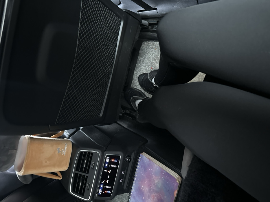 A person wearing black leggings sits in the back seat of a car. A tan plush bag hangs from the back of the driver's seat. A climate control panel and a spiral notebook sit on the center console. A mesh pocket is on the back of the front passenger seat. The car's interior is dark.