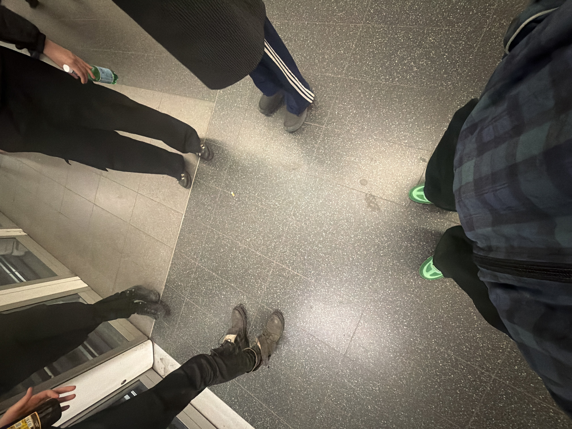 The image presents a high-angle view of the lower bodies of five individuals standing in an indoor public transit station within Paris, France. The flooring consists primarily of dark grey speckled tiles, transitioning to a lighter grey smooth tiled section in the upper-left, adjacent to a white-framed glass automatic door. Artificial overhead lighting illuminates the scene. In the foreground, an individual wears dark trousers, bright green sneakers with a visible white "N" logo, and a blue and green plaid garment draped over their lower torso. To the immediate left, a person in dark trousers and dark brown lace-up boots holds a dark glass bottle with a label in their visible right hand. Further left, near the door frame, a third individual's dark trousers and dark shoes are partially visible. In the upper-right quadrant, a fourth person wears dark trousers, black dress shoes with metallic accents, and holds a clear green glass bottle with a white cap in their right hand. To the left of this individual, the fifth person wears navy blue athletic pants featuring two white stripes along the outer leg and grey athletic shoes. A small, light-colored object, consistent with a discarded cigarette butt, is present on the lighter grey tiled floor. All subjects are depicted in a stationary, standing posture.