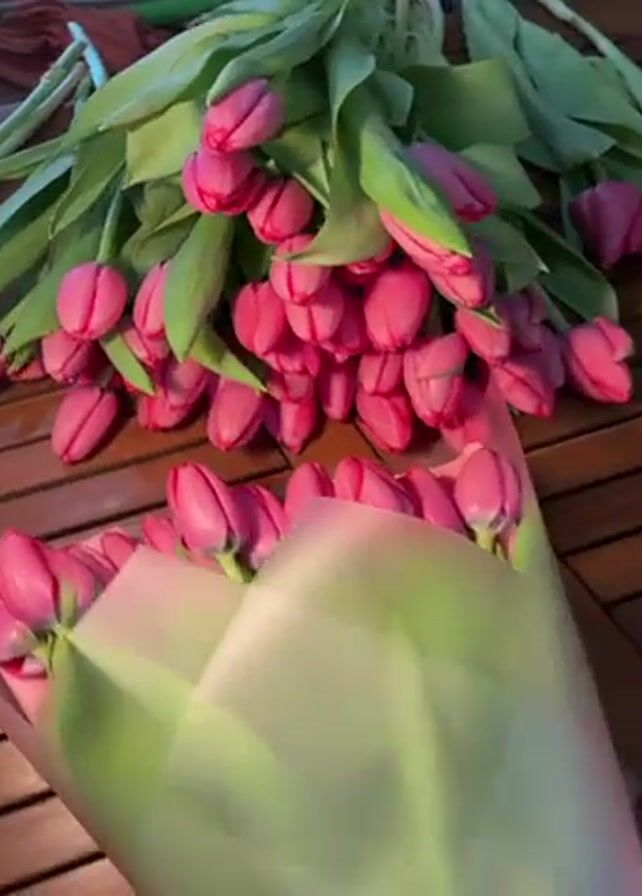close-up of a large bunch of pink tulips lying on a dark brown wooden surface. Some tulips are wrapped in light green paper. The camera zooms in to focus on the petals of the tulips and the arrangement of the flowers. There is no one visible in the video.