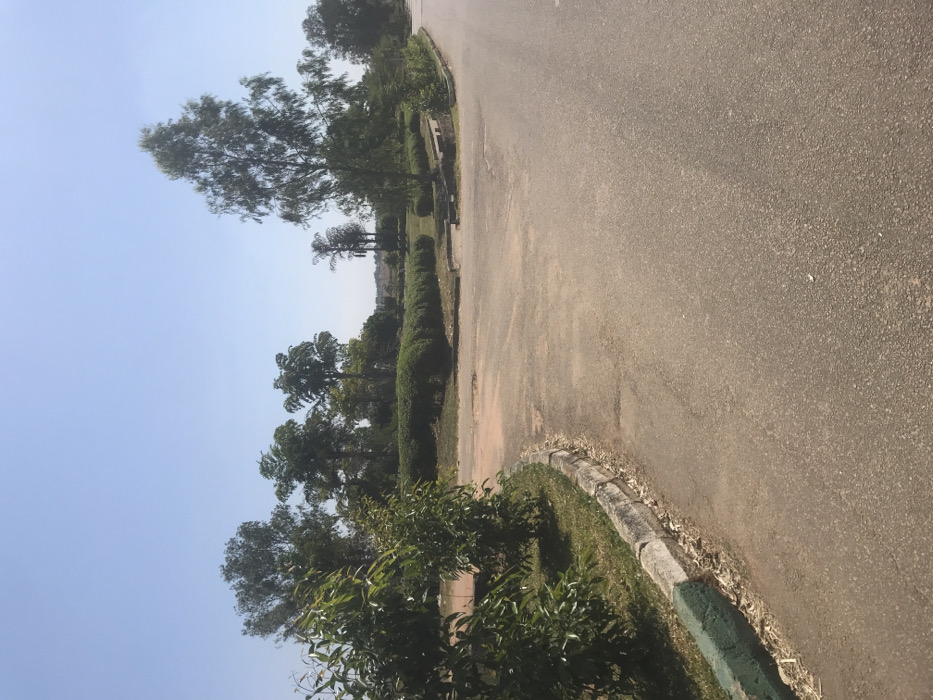 This image depicts an outdoor scene in Kuru Karama, Nigeria, under a clear, bright blue sky with no clouds. The foreground is dominated by an asphalt road, exhibiting a greyish-brown hue and some visible wear, including minor indentations and lighter, possibly dirt-covered, patches. The road curves gently to the left and recedes into the midground. Along the left edge of the road, a concrete curb is visible, with sections painted a dark green, bordering a strip of green grass and dense green foliage from various bushes and small trees. Dried leaves are present along the base of the curb. Beyond the road and immediate vegetation, the midground features a landscaped area characterized by well-maintained green grass and neatly trimmed hedges that form curved beds. Several trees of varying heights and foliage types are scattered across this area. Notable trees include tall, slender specimens with sparse, light-green leaves, and others with denser, broader canopies, some appearing to be palm-like or having large, distinctive leaves. The background shows more distant trees and what appears to be slightly undulating terrain under the clear sky. No individuals, animals, or specific activities are visible within the frame.