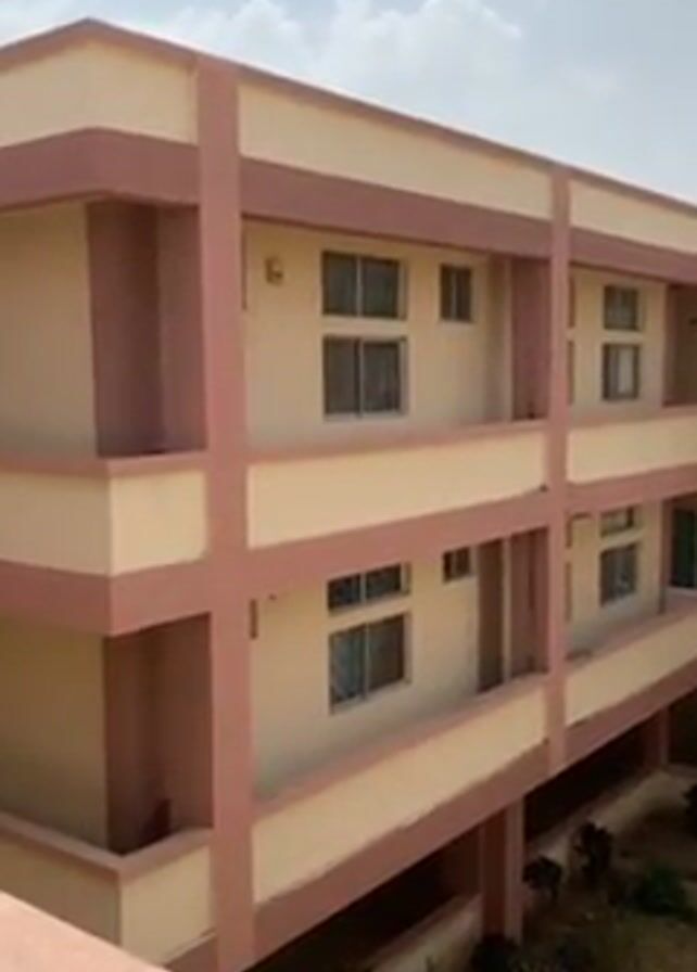 three-story building with a courtyard, possibly a school or a dormitory. The building is painted in light yellow with pink trim. The courtyard has a grassy area with some trees. A walkway connects the building to another similar structure. The sky is partly cloudy. No people are visible. The camera pans across the scene.