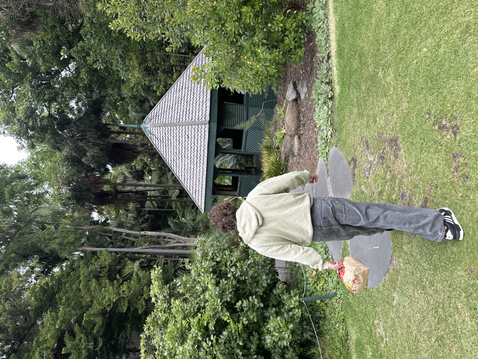 A person with curly hair and a light green hoodie walks across a green lawn carrying a brown bag. A gray-roofed gazebo sits among trees, with green grass and a stone pathway also visible. The overall scene is outdoors, showcasing a natural environment with garden elements.