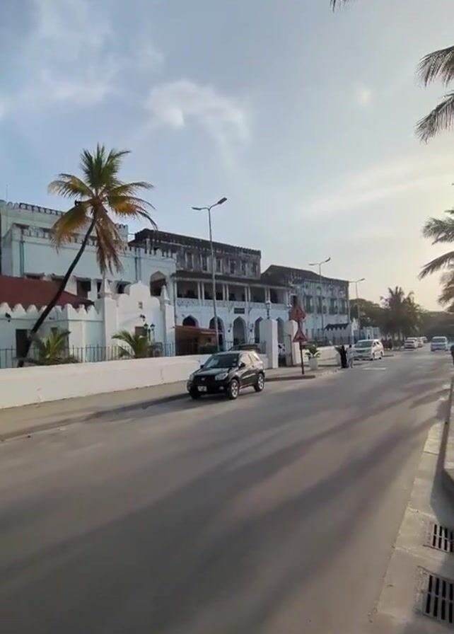 street scene in a sunny, coastal area. A large, white building with red accents stands prominently along the left side of the road, partially obscured by a palm tree. Several other palm trees line the right side of the street, alongside ornate street lamps. Cars and a motorcycle are parked or moving along the road. Several pedestrians are visible on the sidewalk, with one man walking towards the camera, wearing a light blue shirt, jeans, and carrying a backpack. The sky is bright with scattered clouds.