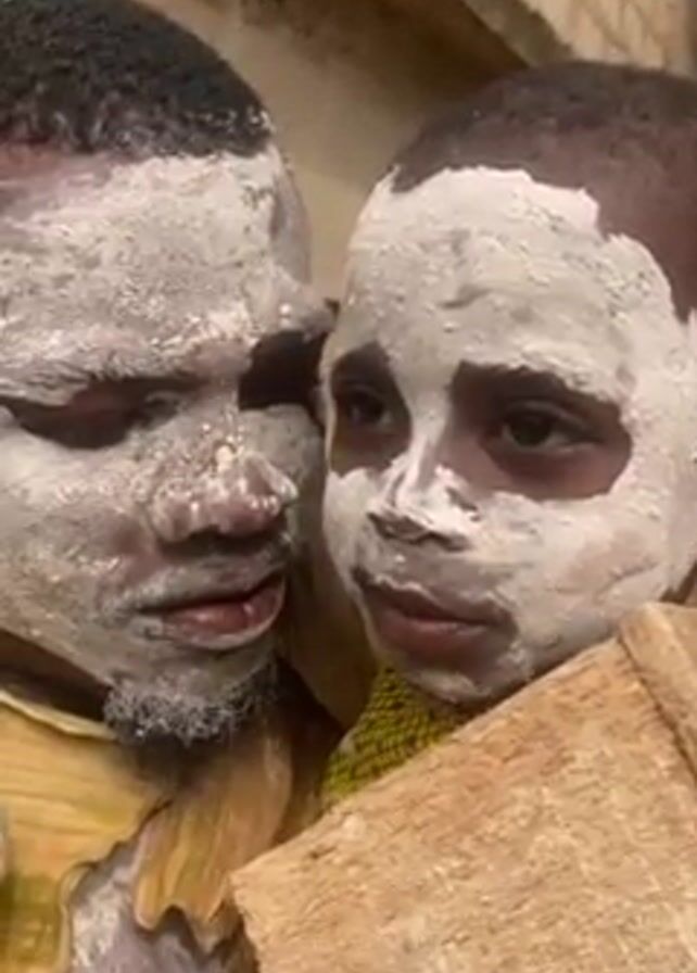 A man and a young child are close together, both with faces covered in a thick white paste. The man has a beard and is wearing what appears to be a costume made of plant material. The child looks to the side and has a piece of what looks like cardboard tucked under their chin. They stand indoors near a wall made of beige bricks. The child says something unintelligible and the man says "Ntiri gu fim?" Then the child says "Eeh". The man says "Jori le fim?" And the child says "Eeh".