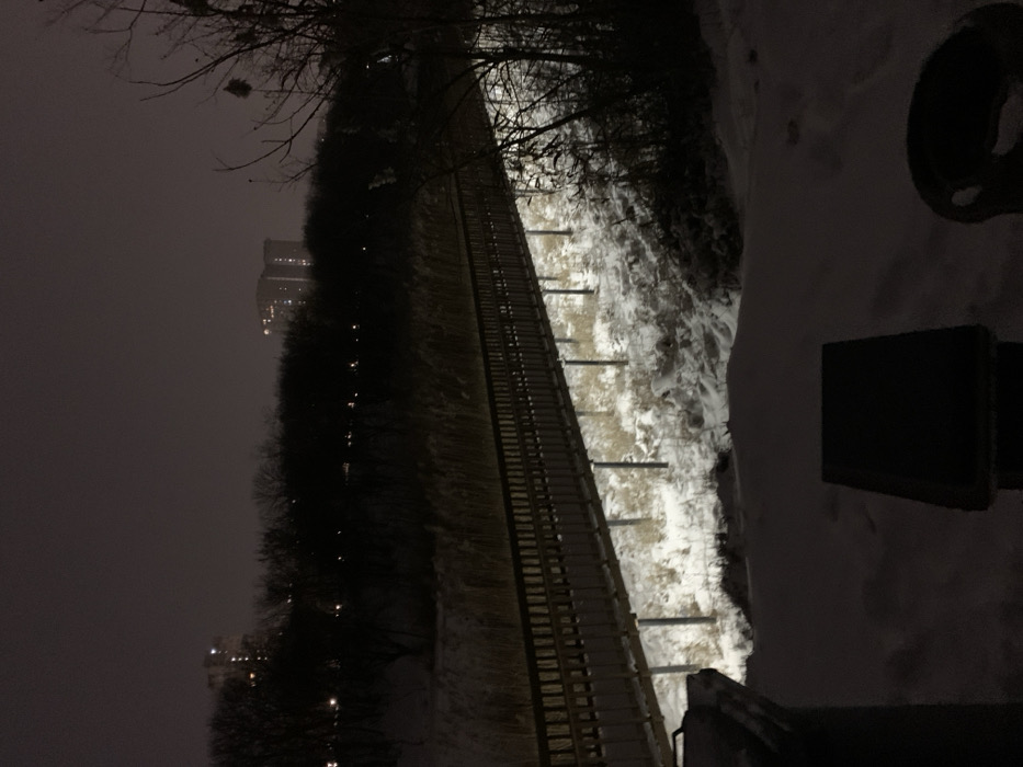 An elevated train track stretches into the dark. Snow covers the ground beside it. Trees are visible along the tracks, and buildings with lights appear in the distance. A park bench is partially visible in the foreground. The sky is overcast.