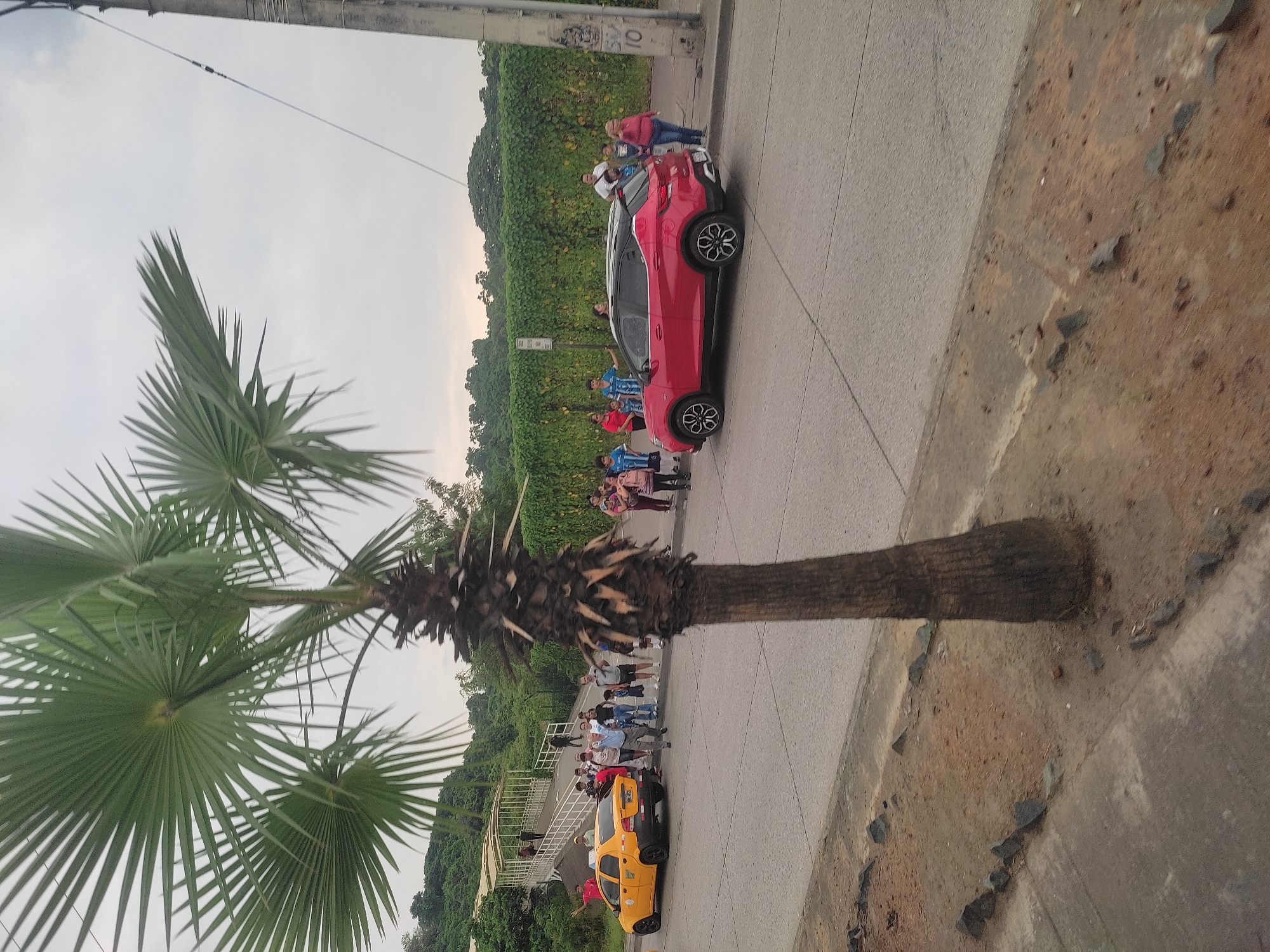 The image depicts a daytime street scene in Guayaquil, Ecuador, under an overcast sky. The approximate location is along Avenida Carlos Julio Arosemena, near a prominent pedestrian bridge ascending a densely vegetated hillside. In the foreground, a palm tree with large, fanned fronds dominates the left side, partially obscuring the upper left quadrant. Its rough, dark brown trunk is centered vertically. The ground beneath consists of reddish-brown dirt, bordered by a concrete sidewalk strip, with small dark rocks arranged in an irregular line. The midground features a two-lane paved road. A yellow sedan-style taxi is stopped in the left lane, facing left, with partially visible license plates starting with "GSE". It has black wheel rims. To its right, a red compact SUV with a black roof and black fender flares is stopped in the right lane, also facing left. A group of approximately 15-20 individuals is clustered around the yellow taxi and near the base of a white pedestrian bridge. They are dressed in casual attire, including t-shirts and jeans, standing and walking. One adult male in a light blue collared shirt and dark pants stands with arms outstretched within this group. Another group of approximately 10-15 individuals, including children, stands on the sidewalk adjacent to the red SUV and further along the road. A woman in a pink top and blue jeans is visible near the rear of the red SUV. On the right side of the road, a tall, dense wall covered in bright green vines forms a continuous backdrop. A grey concrete utility pole with "SO 10" graffiti is positioned on the far right, with utility wires extending upwards. In the background, a white pedestrian overpass with a curved, translucent roof and railings ascends a steep, lush, dark green hillside, visible above and behind the yellow taxi. Several people are discernible on the bridge structure and at its base. The hillside is thickly covered with trees and foliage, extending towards the horizon. The sky is uniformly light grey and overcast.