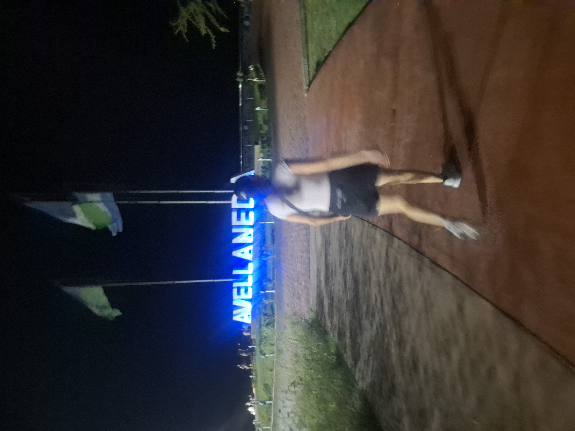 A blurry photo taken at night, likely in Villa Domínico, Argentina, shows a person running on a path. The person wears a light-colored top and dark shorts with light-colored shoes. To the left is a brightly illuminated sign that reads "AVELLANEDA" vertically in blue capital letters. Flags are also seen. There is a separation between the walkway and a grassy area. The ground surface changes in texture, possibly from dirt to asphalt.