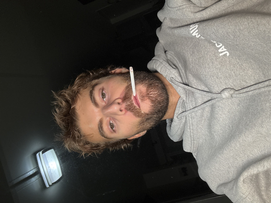 A male individual is depicted in a close-up, low-angle shot, likely a selfie, in an indoor setting within Chambœuf, France. The subject, appearing to be an adult, has light brown, unkempt hair and a full beard. He is wearing a light grey hooded sweatshirt with the word "JACQUEMUS" embroidered in white on the left chest. A white cigarette is held horizontally between his lips. The background is dark, with an illuminated rectangular ceiling light fixture visible in the upper left.