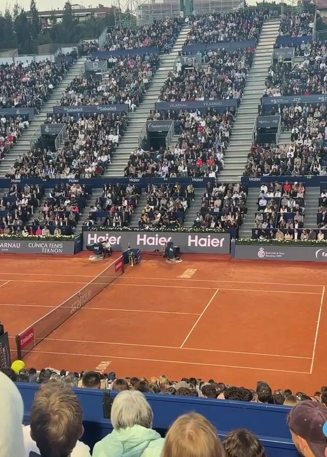A wide shot of a tennis match in progress. The camera is positioned high in the stands overlooking the clay court. Two players are in the midst of a rally, one near the net and the other toward the back of the court. An umpire sits elevated to the left of the net. The stands are full of spectators, mostly seated and dressed in a variety of casual attire. Advertisements line the base of the stands. The sky above is overcast.